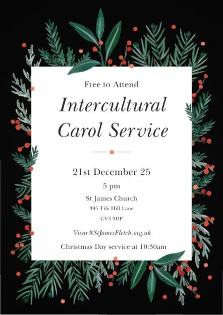 Join us on 21st December at 5pm at St James Church, for a joyful Intercultural Carol Service. This special gathering celebrates the richness of our diverse community as we come together to share carols, traditions, and the message of Christmas in a variety of languages and cultural expressions. Everyone is warmly invited to attend, and the service is completely free. Come and experience the beauty of Christmas through the traditions of many nations as we worship together in unity and hope. There will be mulled wine and minces pie at the end of service.